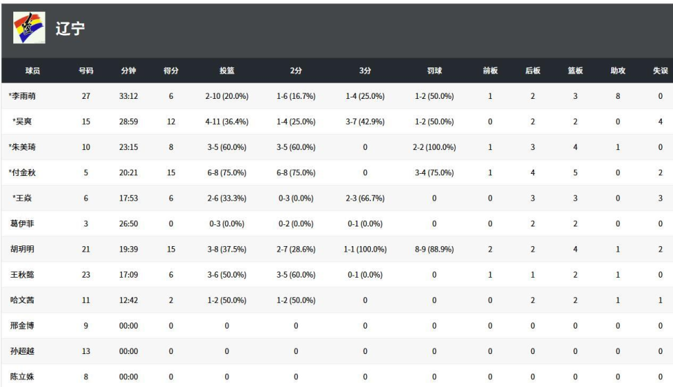 本场比赛辽宁女篮整体表现不佳,全场投篮49投24中,命中率为40.7%,罚球机会也较少,仅获19次罚球。尽管三分球命中率达到41.2%(17投7中),高于上海女篮的29.4%(17投5中),但仍未能扭转战局。辽宁队中仅吴爽(12分2篮板)、付金秋(15分5篮板)和胡玥明(15分4篮板)三人得分上双,李雨萌10投2中仅得6分。