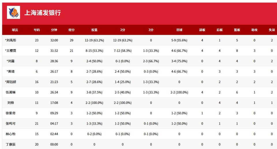 上海女篮的胜利主要依靠刘禹彤和王樱霓的出色发挥。刘禹彤出战32分钟,砍下29分5篮板;王樱霓在31分钟内贡献21分8篮板3助攻。此外,刘露得到9分4篮板,黄靖拿下8分3篮板。全队投篮69投33中,命中率达47.8%,并获得31次罚球机会,展现出更高效的进攻表现。